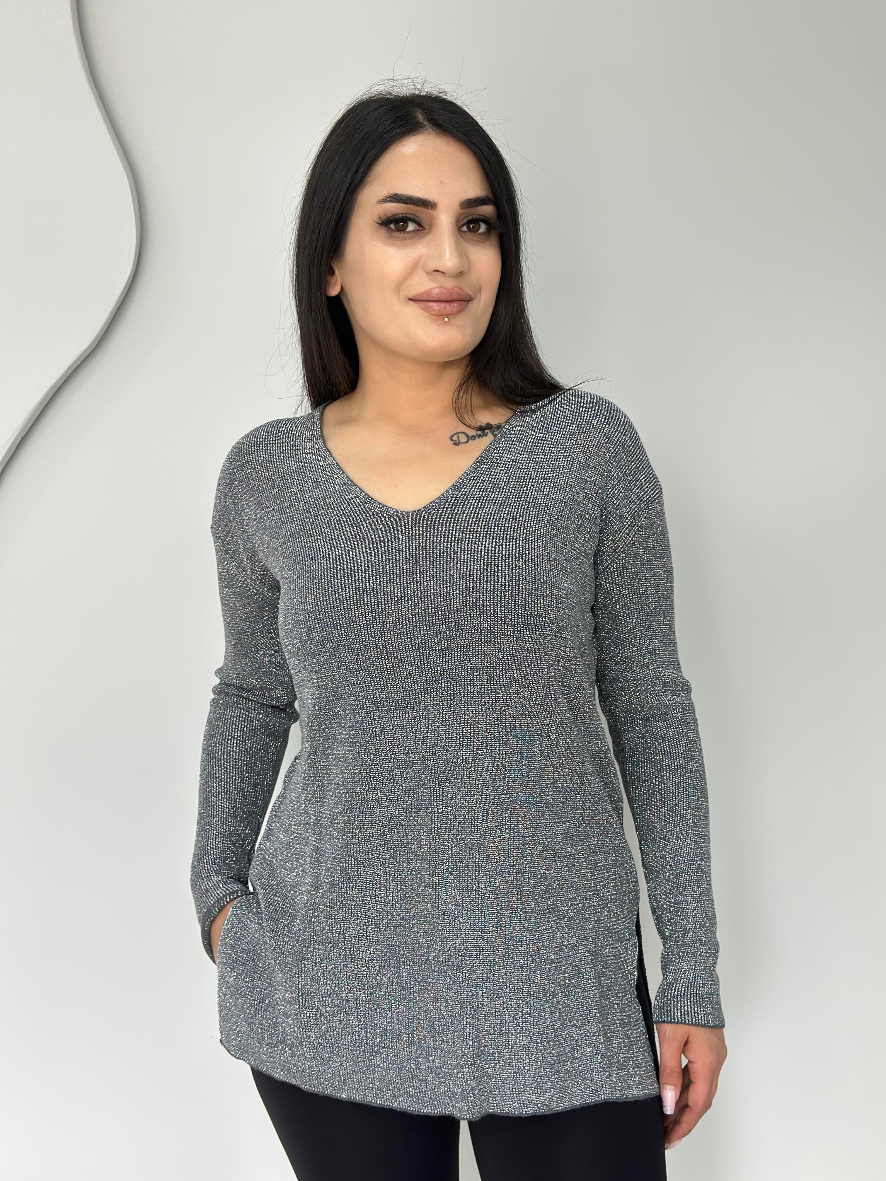 Felix Gümüş V Yaka Simli Yırtmaç Detay Likralı Triko Bluz A107 (A107)