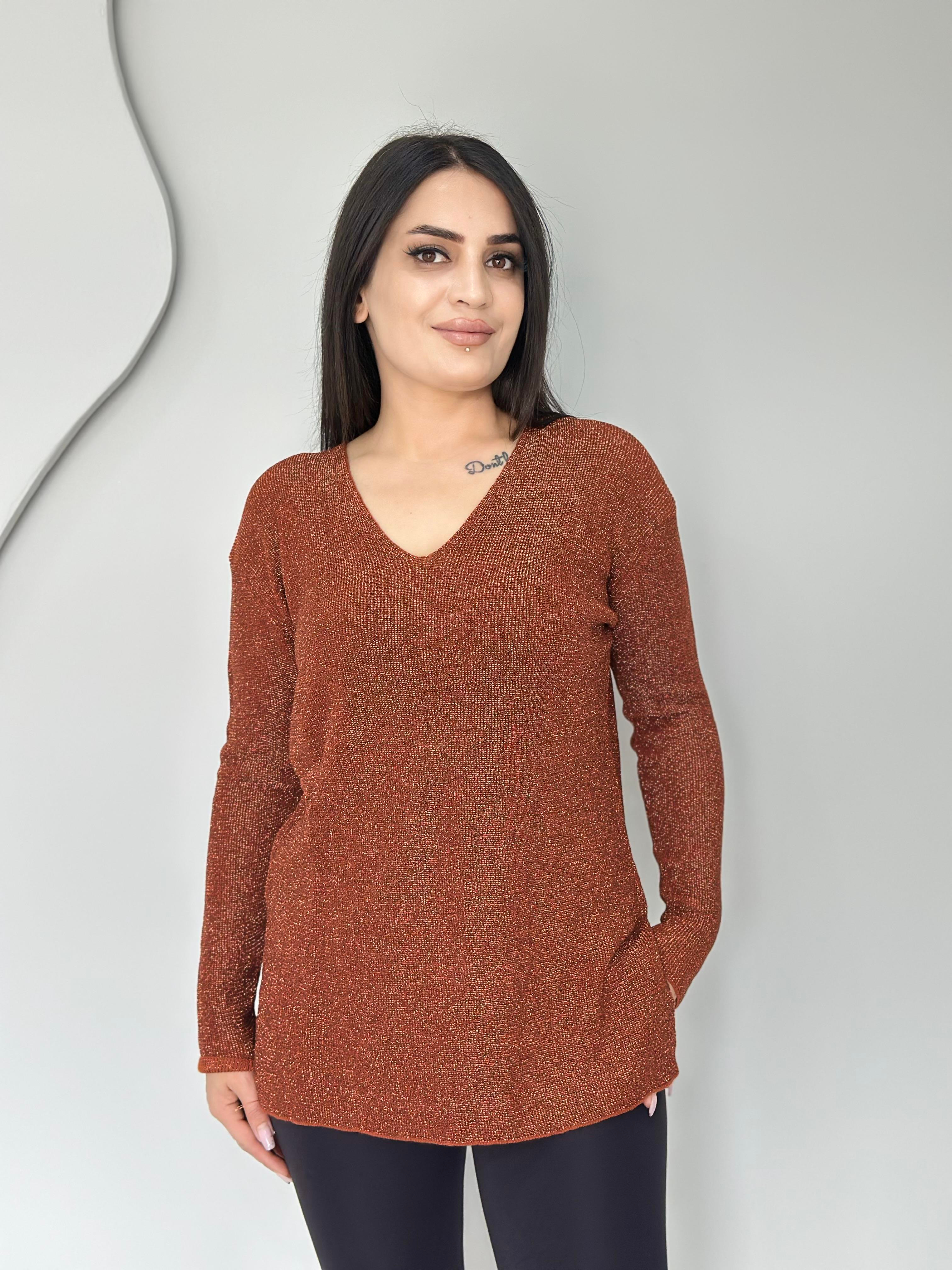 Felix Kiremit V Yaka Simli Yırtmaç Detay Likralı Triko Bluz A110
