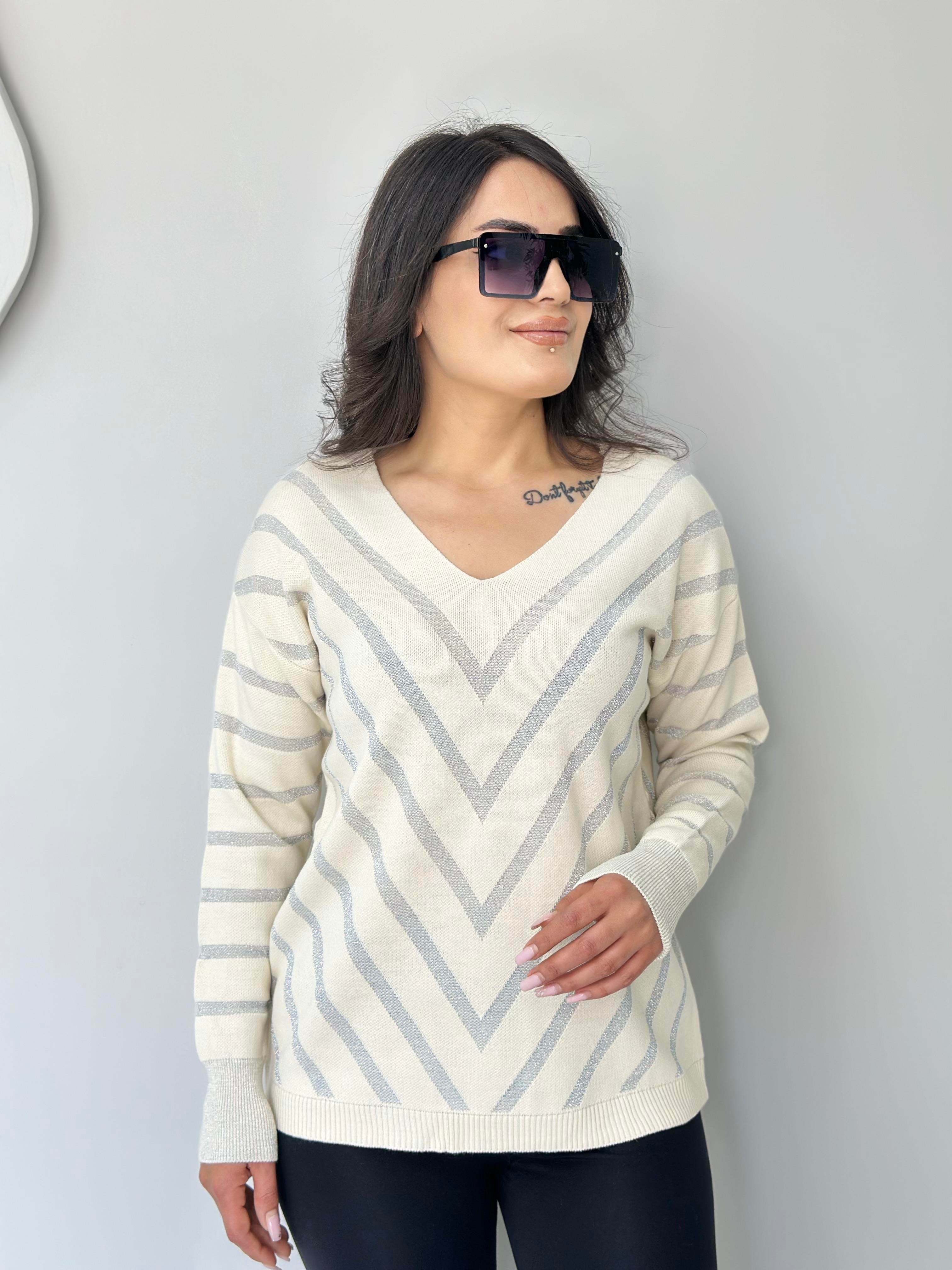 Flok Ekru Simli V Yaka Simli Şeritli Triko Kazak A317 (A317)