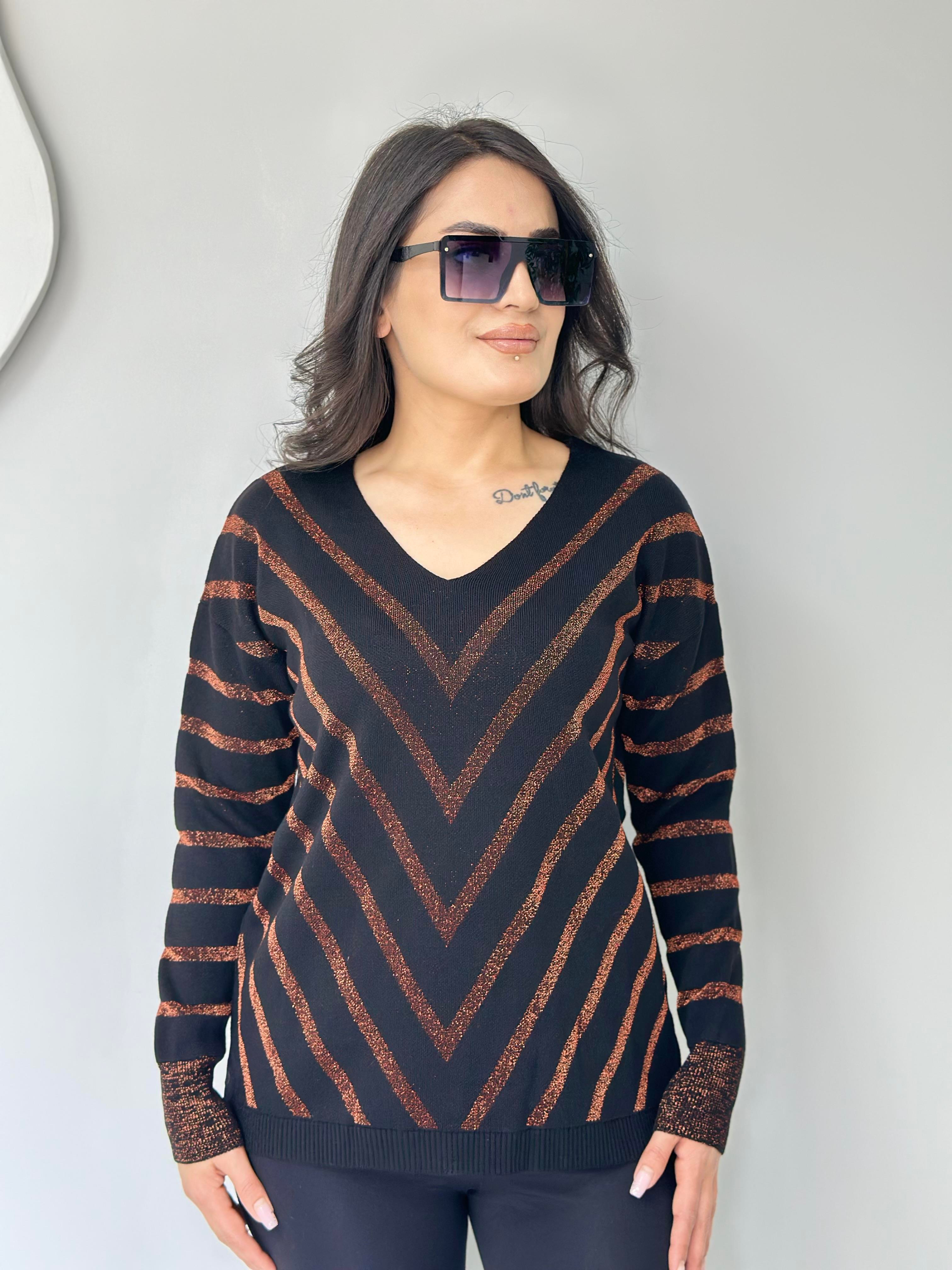 Flok Siyah Bakır V Yaka Simli Şeritli Triko Kazak A313 (A313)