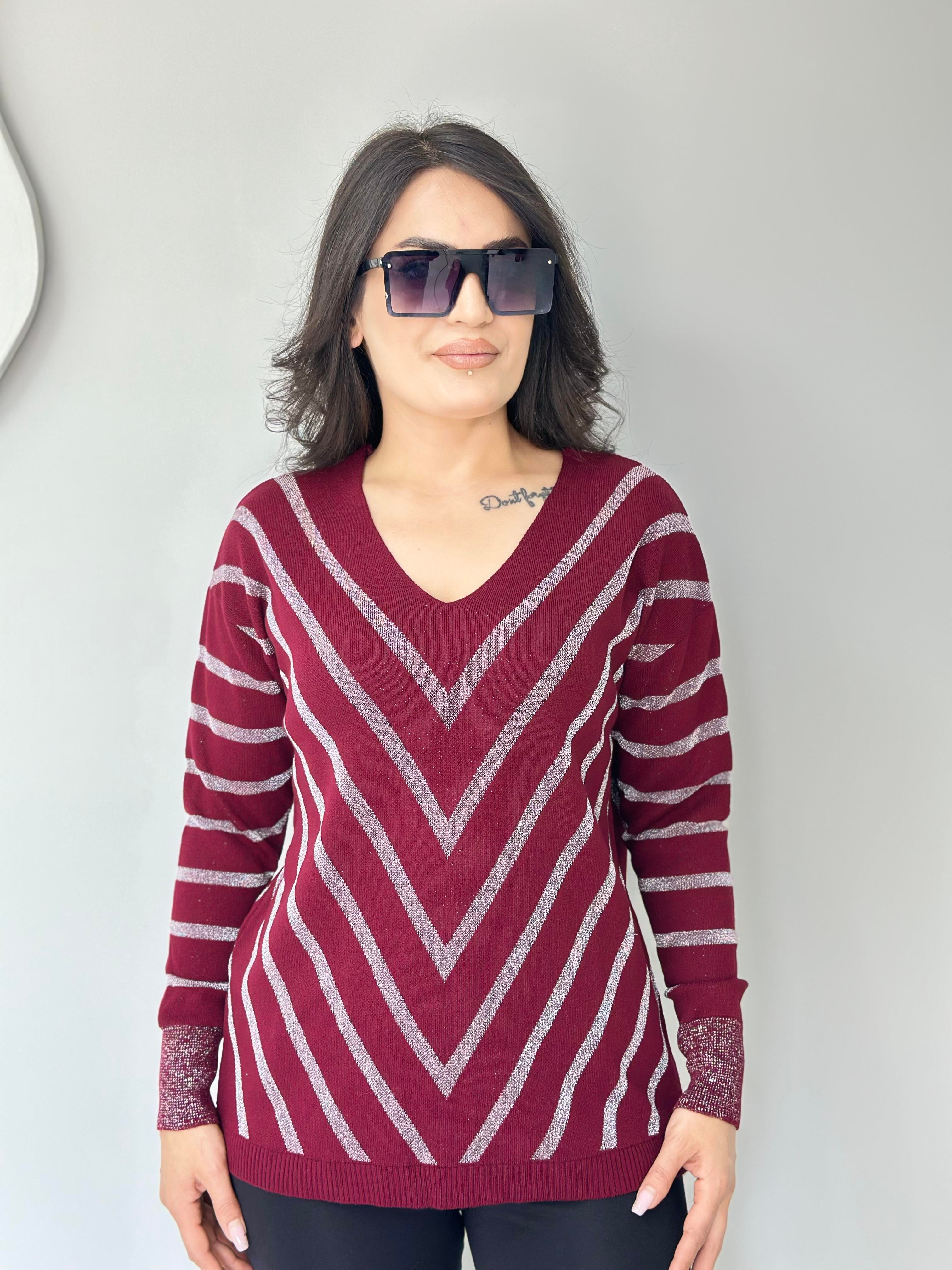 Flok Vişneçürüğü Simli V Yaka Simli Şeritli Triko Kazak A318 (A318)