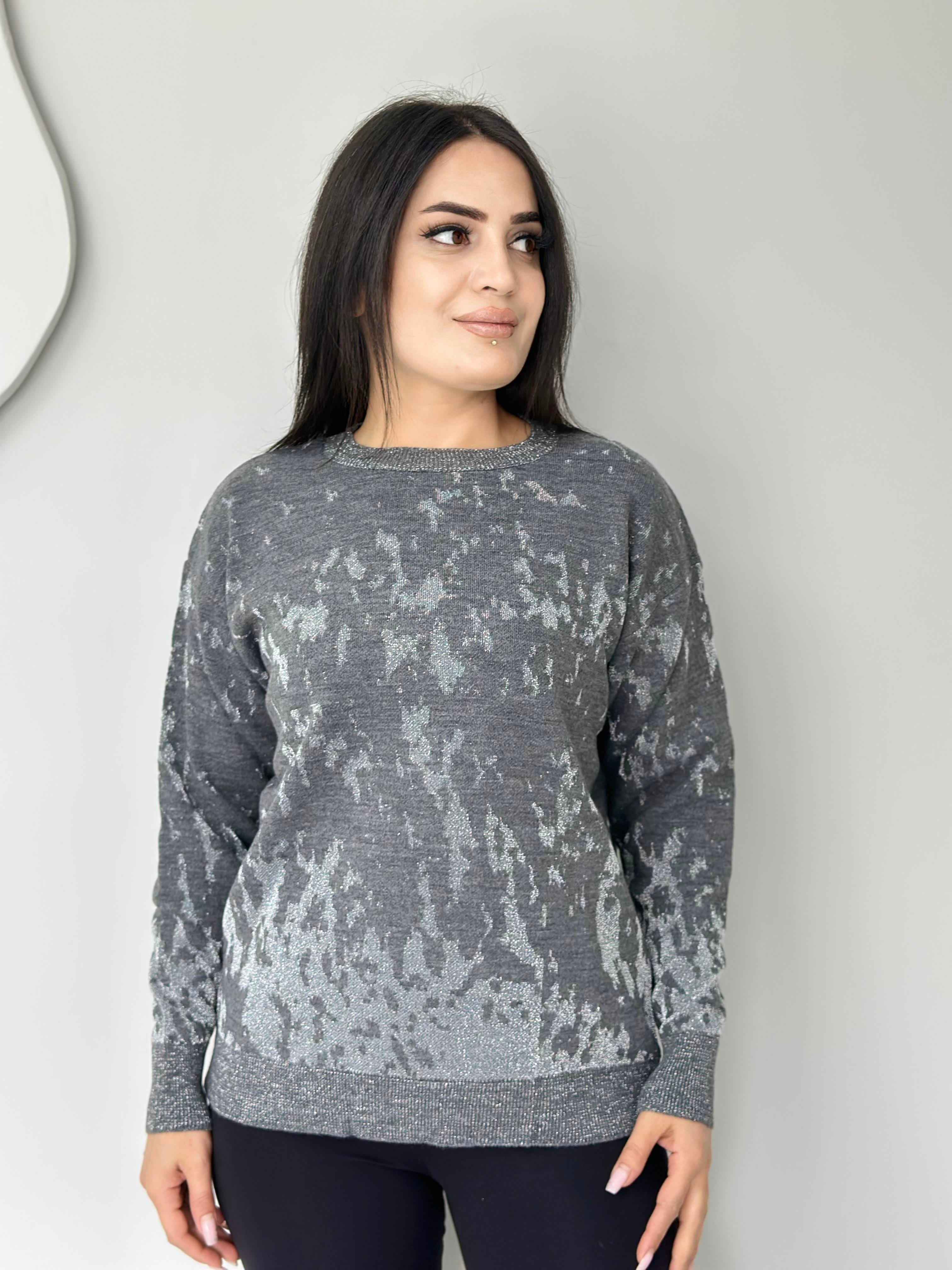 Happy Gri Bisiklet Yaka Sim İşlemeli Batik Desen Likralı Triko Kazak A200