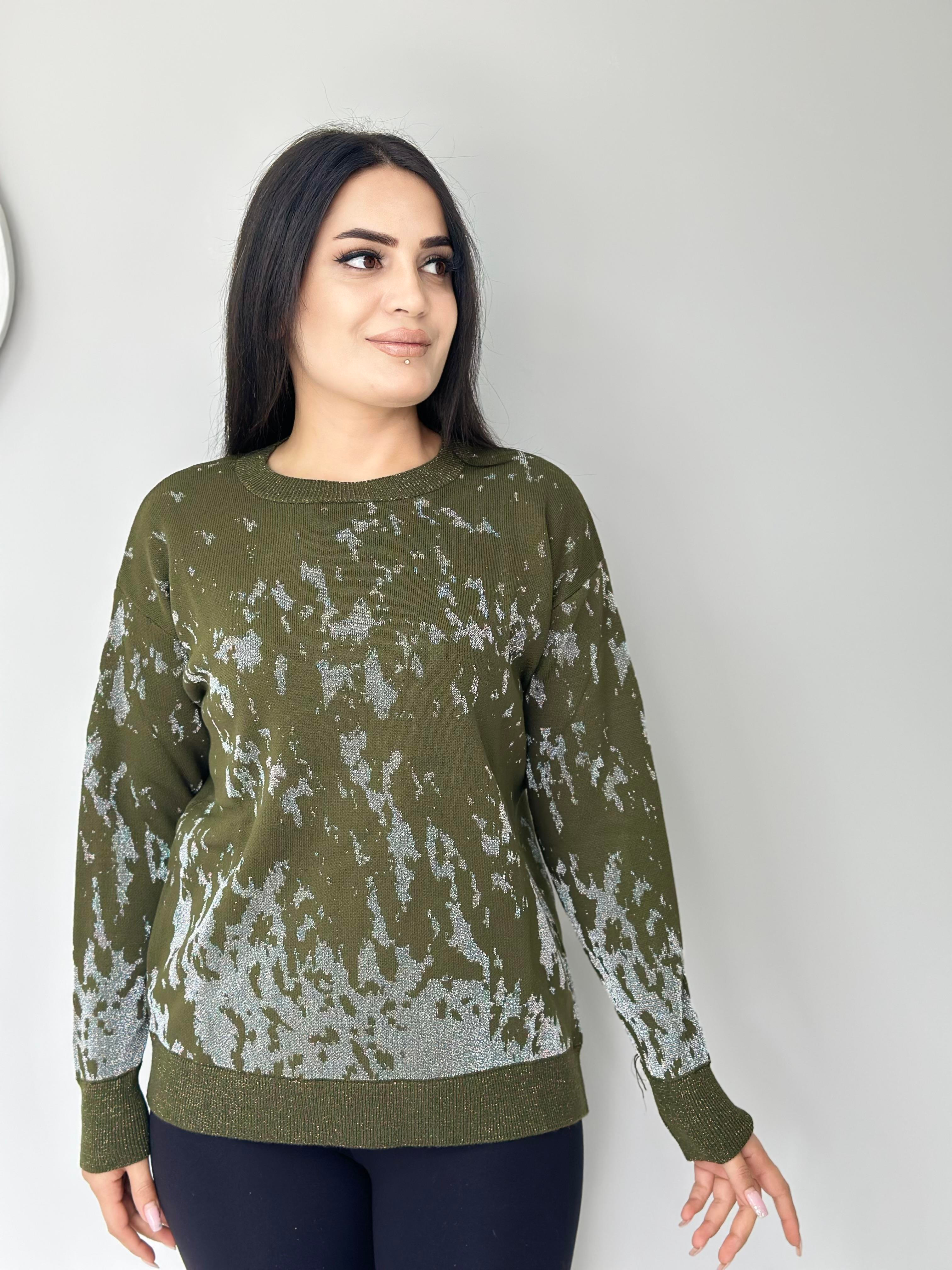 Happy Haki Bisiklet Yaka Sim İşlemeli Batik Desen Likralı Triko Kazak A203