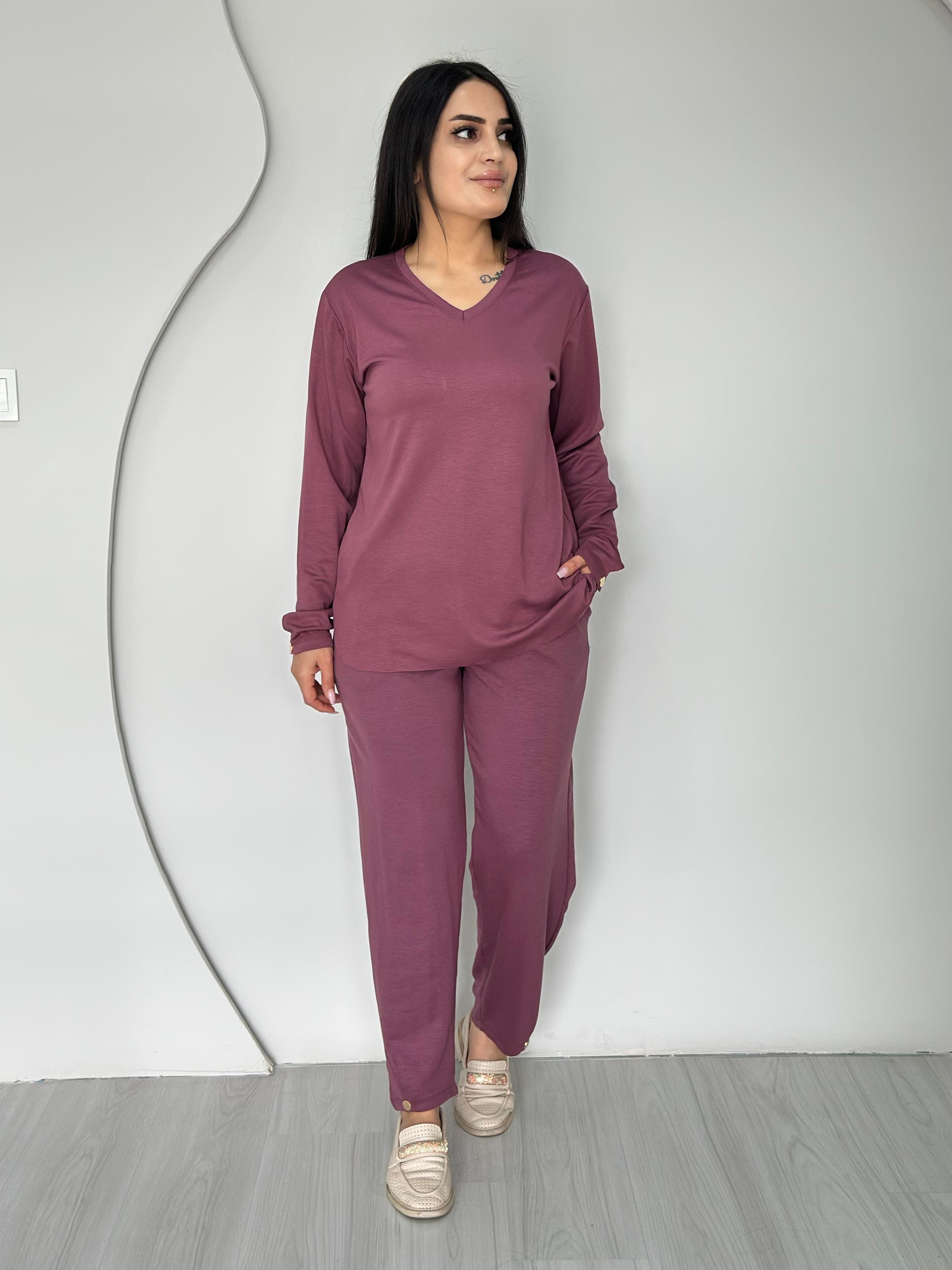 Logi Mürdüm V Yaka İpek Modal Kumaş Kolu Paçası Çıtçıtlı Takım A102