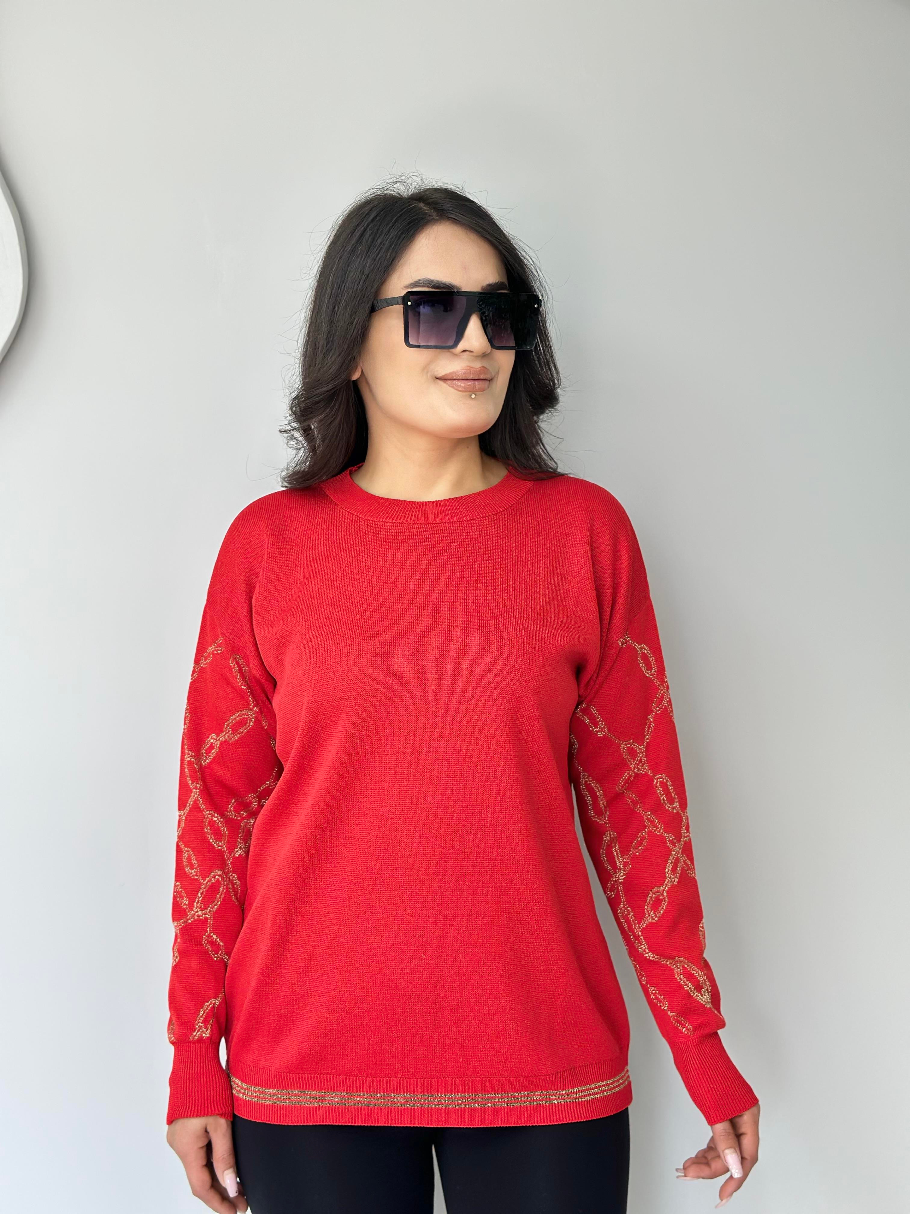 Rush Kırmızı Bisiklet Yaka Kolları Zincir Desenli Triko Kazak A323 (A323)