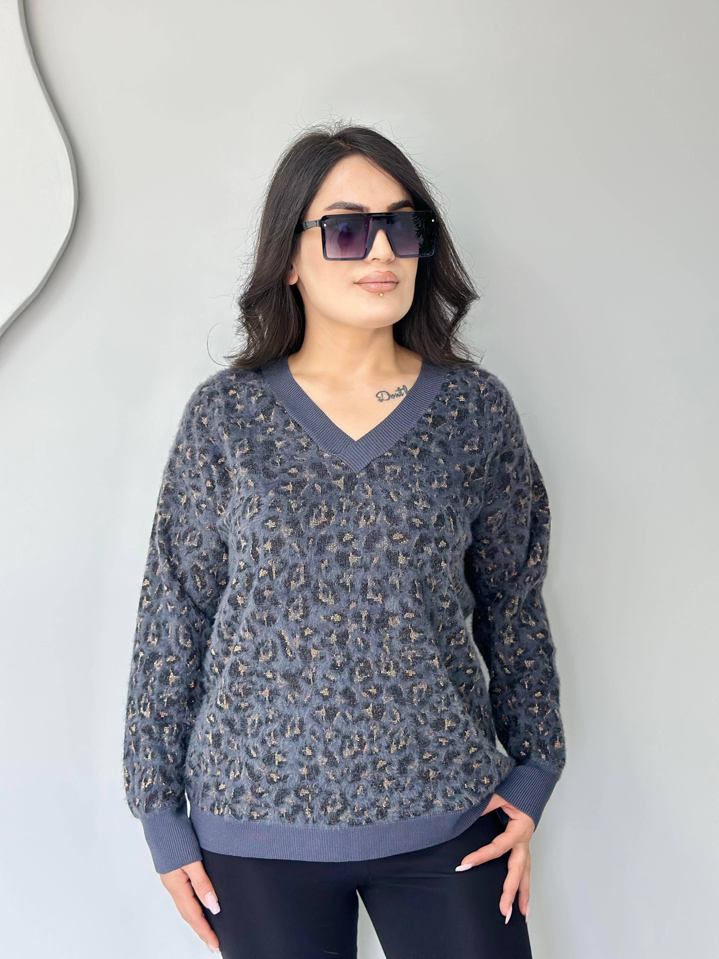 Wild Gri Leopar V Yaka Yumuşak Dokulu Triko Kazak A303 (A303)