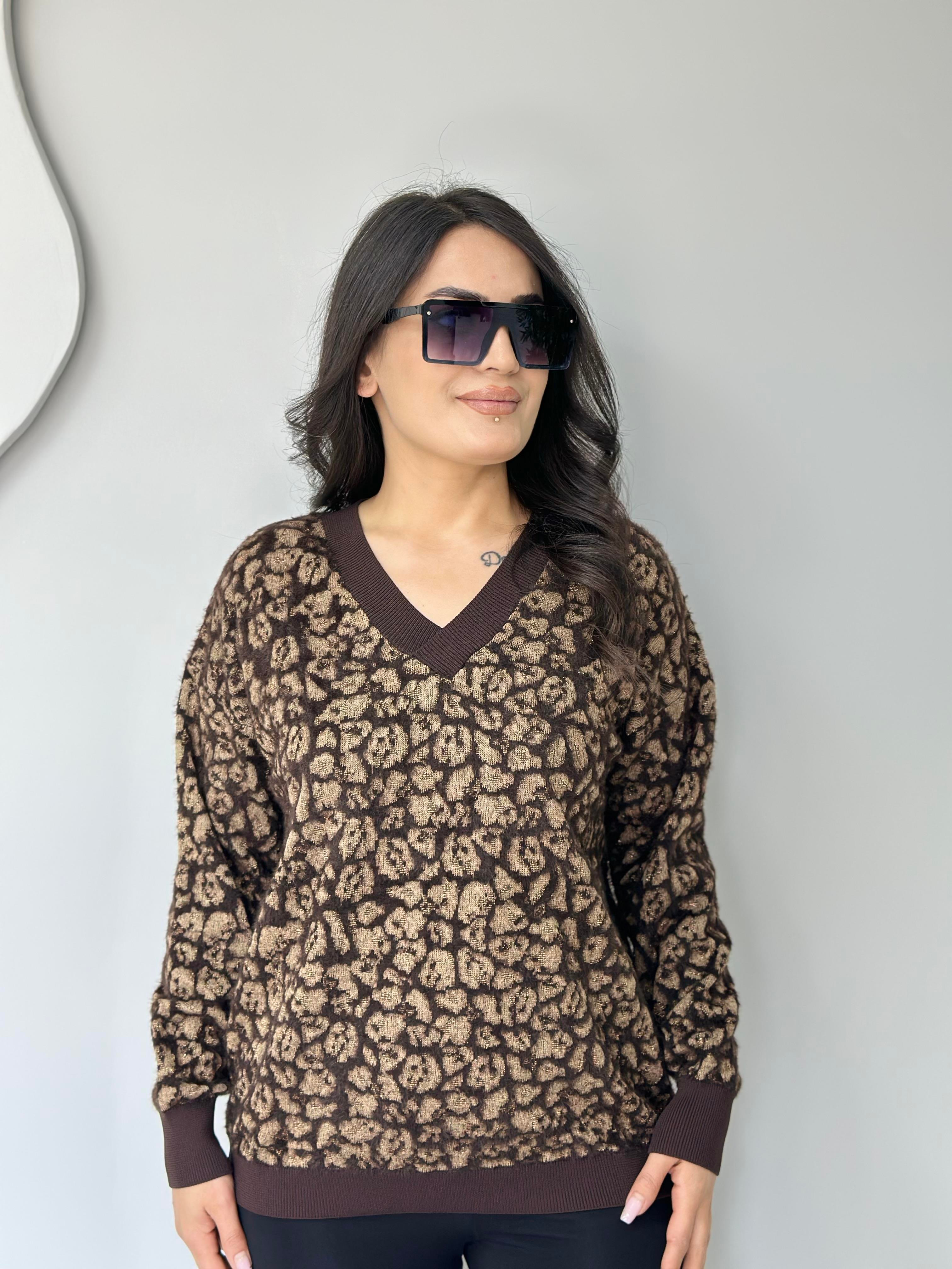 Wild Kahve Leopar V Yaka Yumuşak Dokulu Triko Kazak A302 (A302)